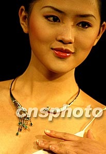 第三屆中國珠寶首飾設計大獎賽十五日在北京揭曉,新絲路名模肖青在頒獎儀式上展示獲得有色寶石組一等獎的項飾“風姿灼爍”。作品既有華麗的外表,也有精練的內涵,雍容高雅,把尊貴和時尚融入一體。來自中國內地、香港、臺灣等地區的近兩千件作品參加了比賽。中新社記者:毛建軍
