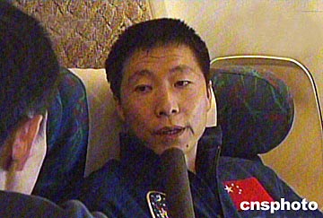 十月十六日,中國航天第一人楊利偉在從著陸點飛往北京的專機上接受中國中央電視臺采訪,描述飛船返回時的感受。中新社圖