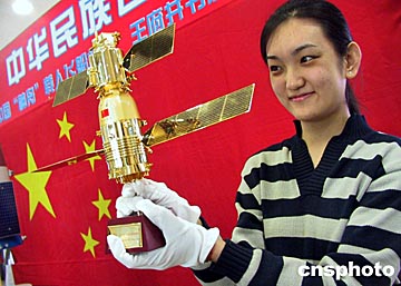 十月十六日清晨,中國首次載人航天飛行獲得圓滿成功,一位姑娘手捧剛剛買到的24K鍍金“神舟”五號載人飛船模型,激動地在北京王府井向路人展示。中新社記者:張勤
