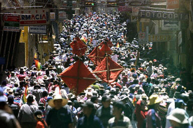 上萬的玻利維亞人10月16日在政府所在地拉巴斯舉行游行示威活動,要求總統貢薩洛·桑切斯·德洛薩達辭職。