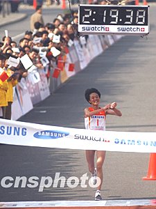 前不久在法國巴黎世界田徑錦標賽上取得一枚銅牌的孫英杰是二00三年三星北京國際馬拉松賽女子組唯一的奪冠“大熱門”。在比賽過程中,孫英杰始終處于領跑的第一集團之中,并于后半程脫穎而出,最終以二小時十九分三十九秒的成績輕松奪得女子組冠軍,創造北京國際馬拉松賽女子組歷史最好成績。