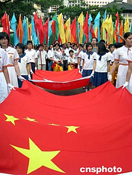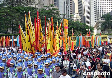 由香港民建聯等多個團體組成的籌委會,十九日上午舉行祝賀中國首次載人飛船上太空成功大巡游活動,約五千名市民參加,氣氛熱烈。作者:譚達明