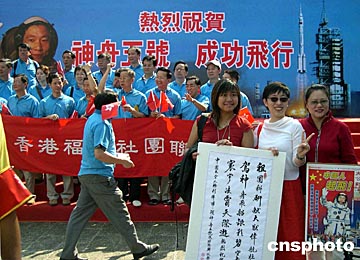 十九日,香港約五千名市民在中環遮打花園步行往灣仔修頓球場,祝賀中國首次載人飛船上太空成功。不少市民在出發前拍照,場面熱鬧。作者:譚達明