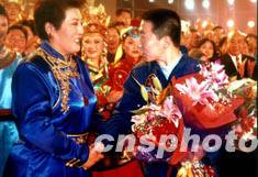 二十四日晚,北京舉行大型文藝晚會《圓夢》慶祝中國首次航天飛行圓滿成功。著名歌唱家德德瑪代表觀眾向航天英雄楊利偉獻花。作者:王玉