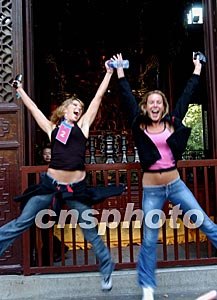 參加中國新絲路世界模特大賽的南美小姐,十月二十九日游覽杭州靈隱寺時在金剛像前歡跳。中新社記者:賈國榮