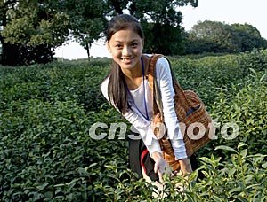 新絲路世界模特大賽的中國佳麗,在十月底金秋時節的杭州郊外龍井學習採茶。中新社記者:賈國榮