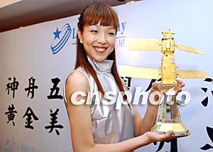 十月三十日,香港推出“黃金美鉆神舟五號飛船”紀念品,它耗用黃金550克,鉆石490枚共13.8卡,價值港幣五十萬。據悉,該紀念品將贈送給即將訪港的中國首位航天員楊利偉。中新社記者:潘索菲