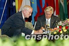澳大利亞前總理霍克(右)十一月三日主持博鰲亞洲論壇2003年會主議題為“亞洲尋求共贏-合作促進(jìn)發(fā)展”的演講會。中新社記者:毛建軍