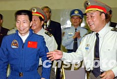 楊利偉與中國首次載人航天飛行代表團受到駐港部隊司令員王繼堂、政委王玉發和官兵們的熱烈歡迎。