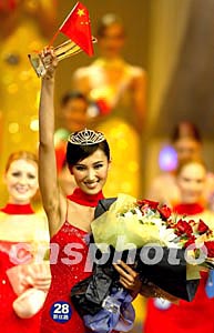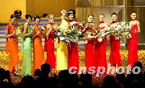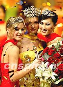 時尚杭州之旅-2003年新絲路世界模特大賽十一月五日晚在杭州浙江省人民大會堂舉行,世界各地的四十五名佳麗參加比賽。來自俄羅斯的維拉(左五)以出色的表現和穩定的發揮勇奪冠軍,中國的邊彥陽(左六)獲得亞軍,挪威選手夏洛特(左四)獲得季軍。中新社記者:毛建軍