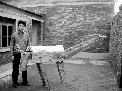 今年31歲的梁國君酷愛《三國演義》、《紅樓夢》、《孫子兵法》等古典著作,尤其對書中涉及的一些古代工藝頗感興趣。去年12月,梁國君觀看央視《科學歷程》節目,得知木牛流馬引起很多人的興趣,但苦于沒人能夠破解其原理并制造出來,讓大家一睹真容。有專家認為木牛流馬可能就是北方的獨輪推車。木牛流馬之謎激起梁國君的好奇心。他認真琢磨,猛然意識到木牛流馬之所以能夠運動,可能依據的是杠桿原理。他立即用硬紙片和釘子做了一只木牛的模型,用手一抬一推,模型果然向前移動,梁國君心里豁然開朗。從此以后,梁國君就利用節假日,按照《三國演義》中所說的尺寸買來木頭,自己關在房間里叮叮當當地鼓搗起來。