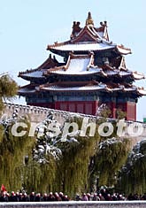 六日晚至七日晨,一場大雪突襲北京。時值深秋,雪后的北京故宮角樓一帶綠樹成蔭、銀裝素裹。一群游客有幸觀賞到少見的秋雪景致。中新社記者:張煒