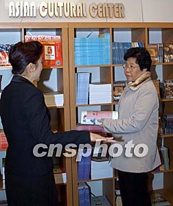 美東時間11月8日上午,中國國務院僑務辦公室主任陳玉杰(右)來到波士頓亞洲文化中心參觀,并在那里與當地華僑華人代表舉行僑情座談會。圖為波士頓亞文中心主任魏晶向陳玉杰介紹情況。陳建 攝