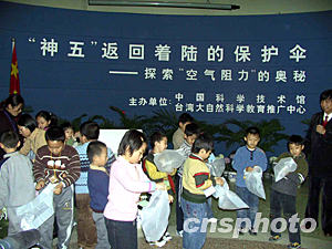 中新社北京十一月九日電(記者孫自法)“‘神舟’五號(hào)飛船返回艙著陸前為什么要用降落傘?”、“降落傘的作用是什么?”……海峽兩岸科普界攜手推出的“中國(guó)科技館大自然科學(xué)實(shí)驗(yàn)活動(dòng)”九日以“神舟”五號(hào)返回著陸為切入點(diǎn),讓參與活動(dòng)的小朋友在動(dòng)手實(shí)踐中探索空氣阻力的奧秘。