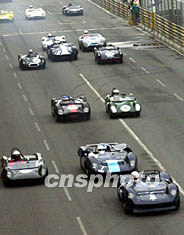 第五十屆澳門格蘭披治大賽車九日進(jìn)行正式比賽,圖為金禧杯中老爺車賽的激烈角逐。中新社記者:李剛