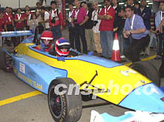 第五十屆澳門格蘭披治大賽車九日特意為澳門市民安排了用雙座位雷諾方程式2000接載乘客的活動(dòng),圖為坐在賽車后座上的這位幸運(yùn)市民起跑時(shí)豎起大姆指,興奮之情溢于言表。中新社記者:李剛