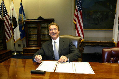阿諾·施瓦辛格于美國當地時間11月17日宣誓就任加利福尼亞州第38任州長。施瓦辛格宣誓就職儀式吸引了大約740名記者參加,規模堪比美國總統就職儀式,世界各地數百萬觀眾觀看了儀式的現場直播。圖為施瓦辛格新官上任首日喜簽首個州長令。