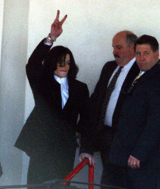 接近美西時間中午時分,邁克爾-杰克遜在雙手被手銬銬住的情況下,由警方和私人律師陪同進入圣巴巴拉警察局。