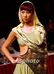 十一月二十五日在北京舉行的“杉杉杯”中國時裝設計新人獎評選中,多位來自大學的年青新秀展示反戰(zhàn)主題時裝,用軍綠色搭配戰(zhàn)爭生活的混亂。中新社記者:賈國榮