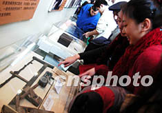 北京“井岡山大型展覽”十天引來七萬多觀眾。圖中兩位參觀的女孩正在討論眼前展品(紅軍當年蓋房子的工具)是什麼。半個多世紀前,毛澤東等在中國南方叢山峻嶺的戰爭故事使許多參觀者感嘆。中新社記者:王麗南