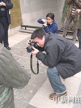 網絡媒體記者拍攝“歷史證人的銅版腳印”。作者:玉樹