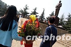 毛澤東誕辰一百一十周年前夕,中國各地的游客紛紛前往湖南韶山參觀毛主席故居,緬懷一代偉人。圖為廣東游客在毛主席銅像廣場敬獻花藍,以表崇敬之意。中新社記者:張宇