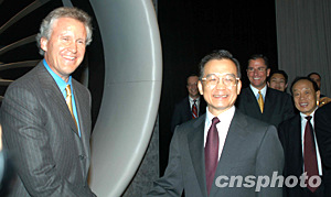 正在紐約訪問的中國總理溫家寶美東時間十二月八日下午,在美國通用電氣公司總裁兼首席執行官伊梅爾特(右)陪同下,參觀美國通用電氣公司。中新社記者:趙海燕