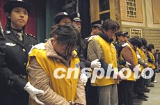 北京警方十二月九日對(duì)在冬季百日會(huì)戰(zhàn)以來查處的聚眾賭博、吸毒販毒、制假販假等五十余名違法犯罪人員進(jìn)行公開處理。中新社記者:任海霞