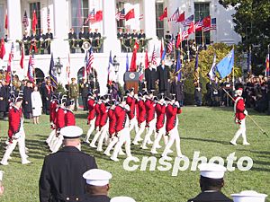 布什與溫家寶在白宮南草坪歡迎儀式上檢閱軍樂隊行進表演。中新社記者 余東暉 攝