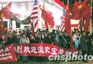 華盛頓僑界9日夜在溫家寶總理演講會場外集會,高呼“國家統一,反對分裂”口號。中新社記者:余東暉
