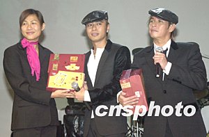 歌星譚詠麟、李克勤12月10日在香港出席《左麟右李04開心演唱會》記者會,擅長搞氣氛的譚詠麟及李克勤會上模仿米高積遜臺風,增添笑料。作者:鄧慶樂