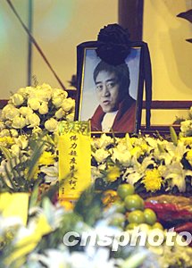 數(shù)十只兩岸三地各界贈送的花圈、花籃把整座三圣殿周邊裝點得分外肅穆,柯受良身著紅西服的半身遺像端放在正殿右側,上端蓋有黑紗,前端放有寫著“佛力超度柯受良先生”的明黃色牌位。根據(jù)家屬意愿,由法師按中國傳統(tǒng)的佛教禮儀為其超度,其親朋依次入殿默哀致意。