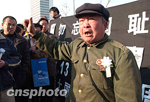 十二月十三日中午,一群臂纏黑紗、胸戴白花的年輕人拉起“勿忘國恥”的橫幅,在北京中華世紀壇附近紀念南京大屠殺六十六周年。這些年輕人通過互聯網自發組織在一起一名正巧路過的退伍老兵深受感染,在紀念橫幅前高唱當年的革命歌曲。中新社記者 張煒