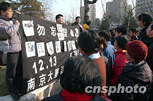 十二月十三日中午,一群臂纏黑紗、胸戴白花的年輕人拉起“勿忘國恥”的橫幅,在北京中華世紀壇附近紀念南京大屠殺六十六周年。這些年輕人通過互聯網自發組織在一起,他們中有公司職員也有大學生。圖為紀念活動吸引大批市民。中新社記者 張煒