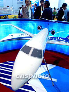 圖為中國與巴西合作生產的50座級ERJ145噴氣式支線客機模型。首架飛機十二月十六日在中國冰城哈爾濱首飛成功。它標志著中國航空工業尋求國際合作戰略的又一里程碑。中新社記者:賈國榮