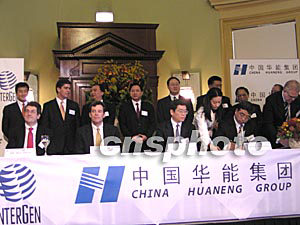 中國華能集團公司成功競標收購美國國際電力公司在澳大利亞的全資子公司奧絲電力百分之五十的股份,總購買價格為2.27億美元。交易雙方于16日在布里斯班正式簽署買賣協議。中國華能集團公司總經理李小鵬(后排左4)說,此次收購是華能在海外的第一次重大投資。中新社記者 劉雨生 攝
