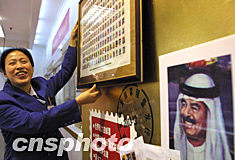 由香港著名畫家劉宇一設(shè)計(jì)的“新千年世界元首郵票大全”十九日起在北京貴友大廈獨(dú)家銷售,這組由一百九十位國(guó)家元首畫像構(gòu)成的世界張數(shù)最多的大聯(lián)張郵票售價(jià)兩千九百元人民幣并需要提前預(yù)定。其中倍受矚目的伊拉克前總統(tǒng)薩達(dá)姆頭像郵票更被放大張貼,成為這組郵票的銷售熱點(diǎn)。中新社記者:廖文靜