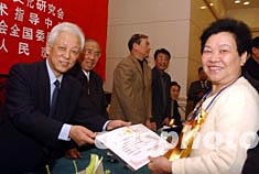 十二月二十二日,中國(guó)餐飲業(yè)最高獎(jiǎng)項(xiàng)“伊尹獎(jiǎng)”頒獎(jiǎng)表彰大會(huì)在北京人民大會(huì)堂舉行,全國(guó)政協(xié)副主席周鐵農(nóng)(左)等向劉寶等二十八名獲獎(jiǎng)?wù)哳C發(fā)了證書。中新社記者:武仲林
