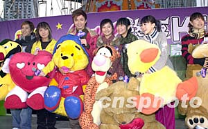 歌星鄧健泓、何韻詩、古巨基、組合Cookies四人(左起)12月22日在香港添馬艦廣場舉行之《環球嘉年華2003/4》出席「Neway 終極K Fun嘉年華」演唱會,獲主辦機構送上大型毛公仔,以感謝為在場樂迷獻唱同樂。中新社記者:鄧慶樂