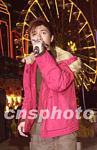 歌星古巨基12月22日在香港添馬艦廣場舉行之《環球嘉年華2003/4》出席「Neway 終極K Fun嘉年華」演唱會,為在場樂迷獻唱助慶。中新社記者:鄧慶樂
