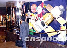 隨著“神舟五號(hào)”載人飛船的成功返回,香港也曾掀起一股航空熱。在商場(chǎng)圣誕裝飾中,以圣誕老人乘飛船亦成為香港圣誕裝飾一景。中新社記者:譚達(dá)明