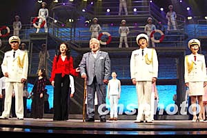 中國首部海軍題材大型原創音樂劇《赤道雨》將于12月24日至25日在北京天橋劇場公演。圖為中國海軍新型導彈驅逐艦艦長潘天雨(右二,由海軍歌唱演員呂繼宏扮演)和旅美華僑肖可悅(左二,歌唱演員宋祖英飾)攜外公姚漢唐(霍勇飾)登上中國軍艦放聲歌唱。作者:張全躍