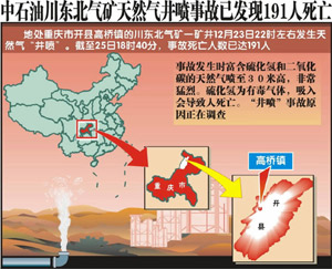 截止25日十九點,重慶市開縣天然氣井噴事故已造成一百九十一人死亡。