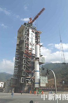 圖:"長征二號丙"改進型運載火箭一、二級吊裝上發射塔架