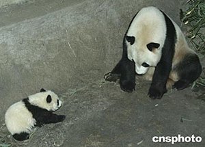 2004年新年鐘聲敲響前的2003年12月31日晚,出生整整一百三十天的北京動物園大熊貓“甜甜”在媽媽“妞妞”期待的目光和輕聲的召喚聲中,搖搖晃晃一步一步向前走。“甜甜”2003年8月24日在北京動物園出生,目前的體重已經從出生時的150克增長到8,060克,預計在半周歲后斷奶離開媽媽獨立生活。中新社記者:任晨鳴
