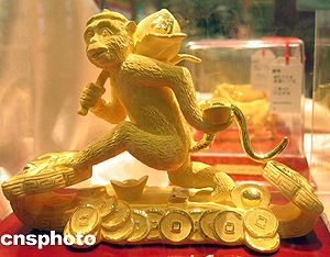 猴年伊始,上海各大金店里金猴成群,表達了“四季平安”、“招財進寶”等各種吉祥之意。井韋 攝