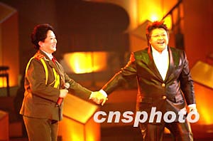 中國(guó)文聯(lián)十一日在北京舉辦《百花迎春--中國(guó)文學(xué)藝術(shù)界2004春節(jié)大聯(lián)歡》活動(dòng),著名歌手韓紅和母親雍西同臺(tái)演唱《翻身農(nóng)奴把歌唱》。中新社記者:王瑤