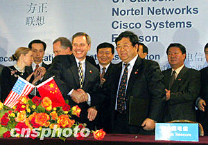中新網1月14日電 中國經貿采購團十三日在此間與美方簽署了價值二十三點二億美元的十一個合同,采購先進的電子和通訊設備。獲得訂單的是美國的摩托羅拉、朗訊、英特爾、北電網絡、思科、愛立信、UT斯達康等信息產業巨頭。其中摩托羅拉是最大贏家,它從中國聯通和中國移動獲得了近十點七億美元的GSM和CDMA設備合同,將分別被用于中國十三個省市的移動通訊網絡建設。