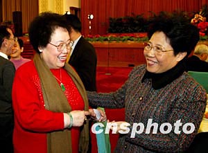 2004年僑界新春茶話會十四日在北京人民大會堂舉行,國務(wù)院僑務(wù)辦公室主任陳玉杰(右)與全國政協(xié)委員、香港富商陳麗華親切交談。中新社記者 毛建軍 攝