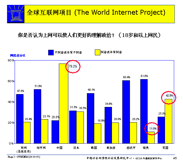 總的來說,多數國家的網民有一個共同的趨向:更多的人相信互聯網能夠幫助人們理解政治事件,而不是給與他們更多的政治權利。